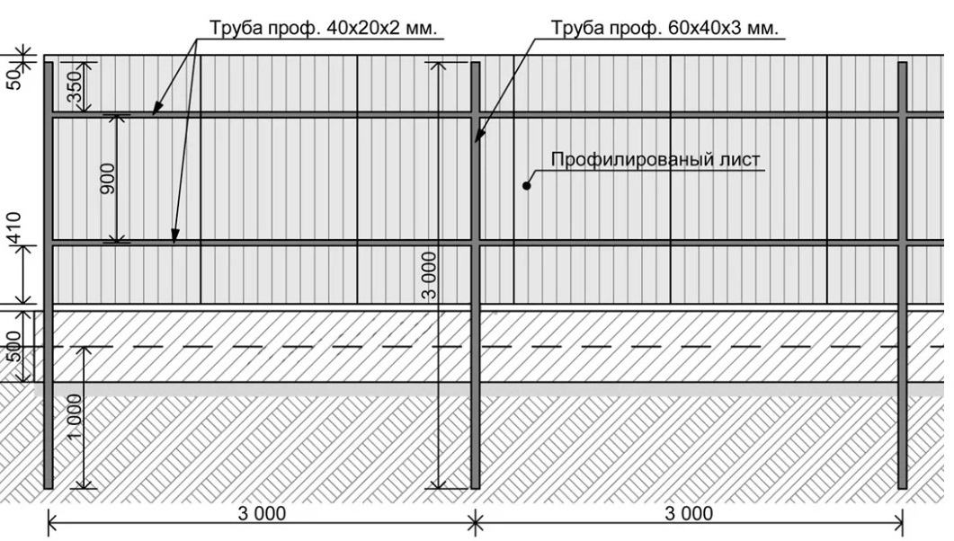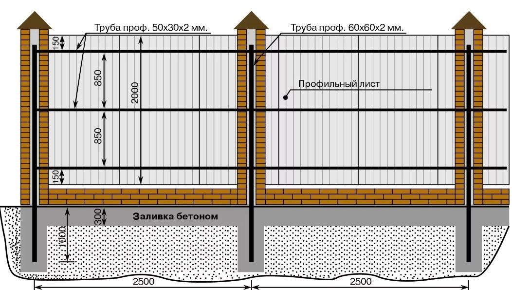 Конструкция забора из профлиста на ленточном фундаменте и с кирпичными столбами